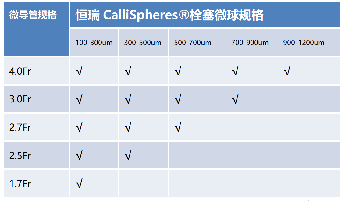 7、規(guī)格型號齊全。粒徑大小適宜,可通過微導(dǎo)管進行遞送,且有多種粒徑大小供醫(yī)生根據(jù)具體血供情況的差異來選擇合適的規(guī)格