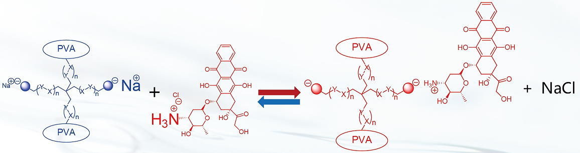 作用機制:自有的專利技術(shù)通過利用含負電荷的有機小分子基團為微球引入負電荷,利用正離子交換機理實現(xiàn)對帶正電荷抗腫瘤藥物的吸附。